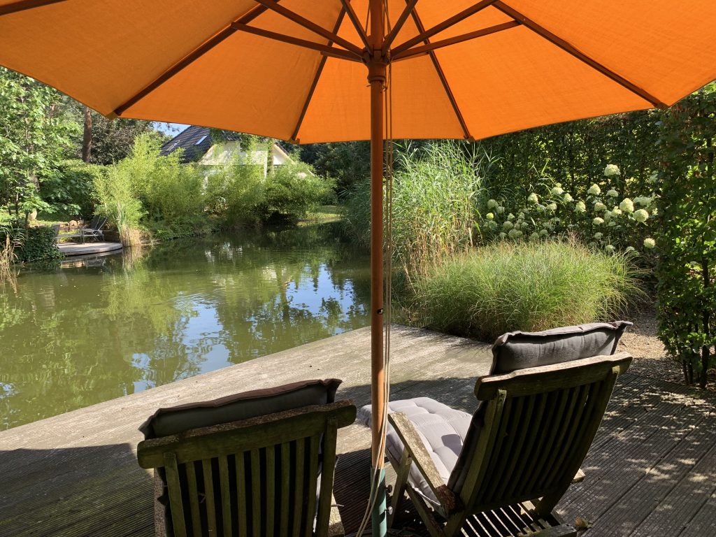 Villa Lunteren is a luxurious and comfortable detached holiday home for adults with and without children. The villa is located at Landgoed (Estate) de Scheleberg, in Lunteren at the Veluwe in the Netherlands. The villa has two private parking spaces and is situated on a private plot of 9,600 sqft. The available for rent interior space of the villa is 1,400 sqft, spread over three floors. The well-kept stylish garden has two terraces, of which one at the water. The villa is equipped with underfloor heating and has three bedrooms, two bathrooms (one with separate shower and bathtub) and a richly equipped kitchen with oven, microwave and freezer. A large table for dining and a living room with a comfortable couch and chairs are available. The villa offers WiFi. A unique feature of the villa is the box bed bedroom with doors opening to the garden pit; a sleeping experience every child will remember!